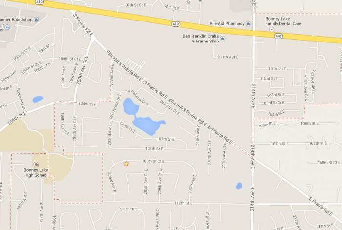 Cedar Ridge is located in an unincorporated part of Pierce County in Bonney Lake, WA; just off of State HWY 410 E. following 214th Ave E south and turning right on 112th Street E, proceeding to the end of the road. Entrance and signage on the right side.